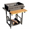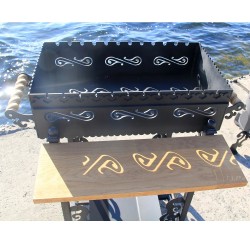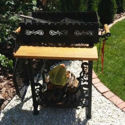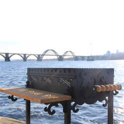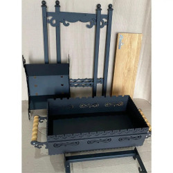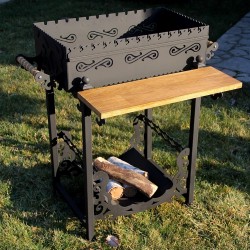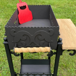 Exklusiver Mangal-Grill Vostichnij mit Eichenholzablage, orientalischem Design und Platz für bis zu 12 Spieße. Robuste Stahlkonstruktion (4 mm), Holzfach, Griffe aus Eiche. Inklusive Schürhaken und Fächer zum Anfachen des Feuers – perfekt für stilvolles BBQ und Mangal-Abende im Garten.
